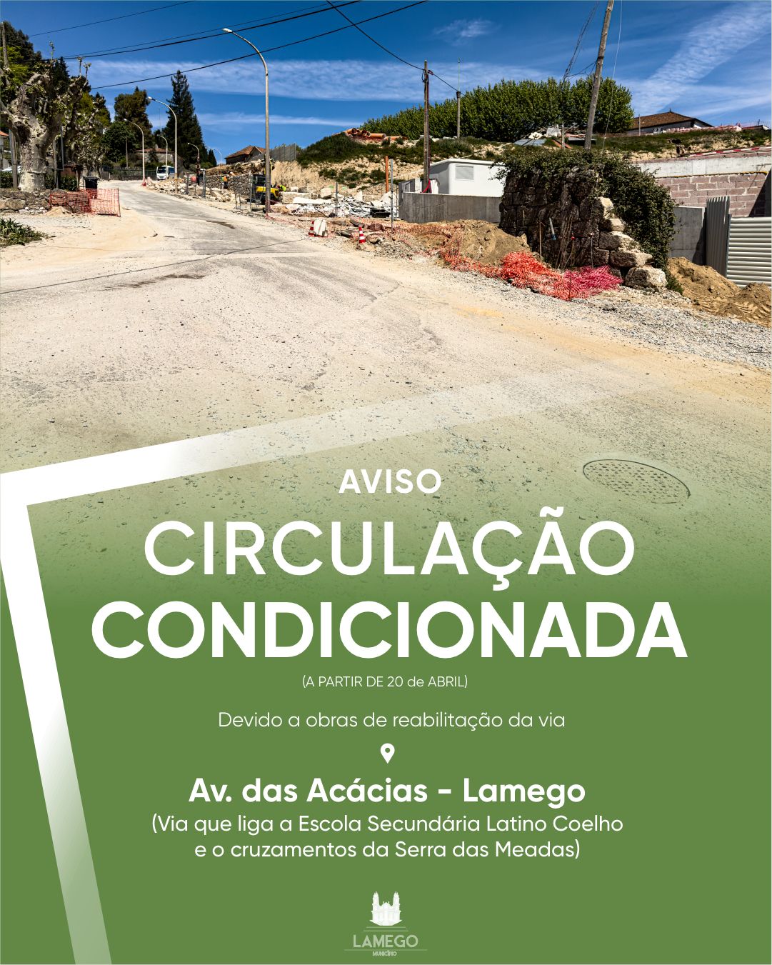 A Câmara Municipal de Lamego informa que, devido às obras de reabilitação da Av. das Acácias, via que liga a Escola Secundária Latino Coelho e o cruzamento para a Serra das Meadas, será condicionada a circulação automóvel nesta estrada, a partir da próxima segunda-feira, dia 20.