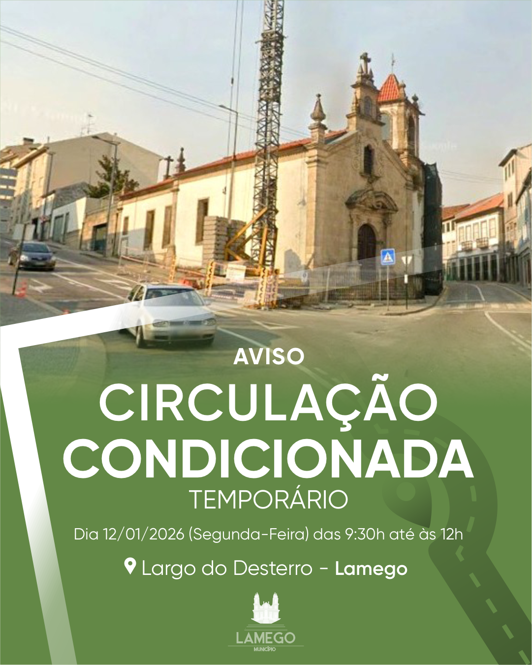 A Câmara Municipal de Lamego informa que, devido à realização de trabalhos de desmontagem e mobilização de uma grua de obra, será condicionada a circulação automóvel no cruzamento que liga as ruas do Desterro, Calçada, Cardoso Avelino e D. Egas Moniz na próxima segunda-feira, dia 12, entre as 9h30 e as 12 horas.