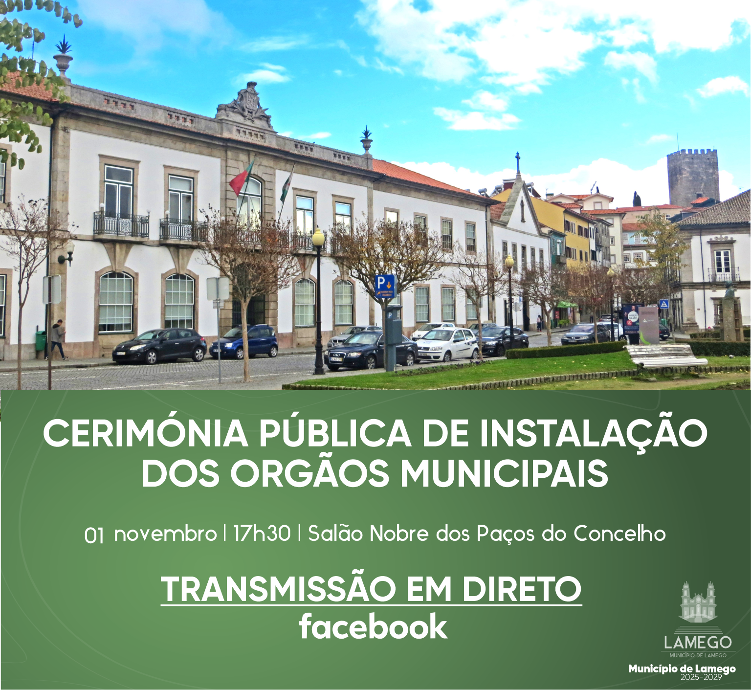 O Município de Lamego informa que a cerimónia de instalação dos órgãos autárquicos para o mandato 2025/2029 terá lugar no próximo sábado, dia 1 de novembro, às 17h30, no Salão Nobre dos Paços do Concelho.