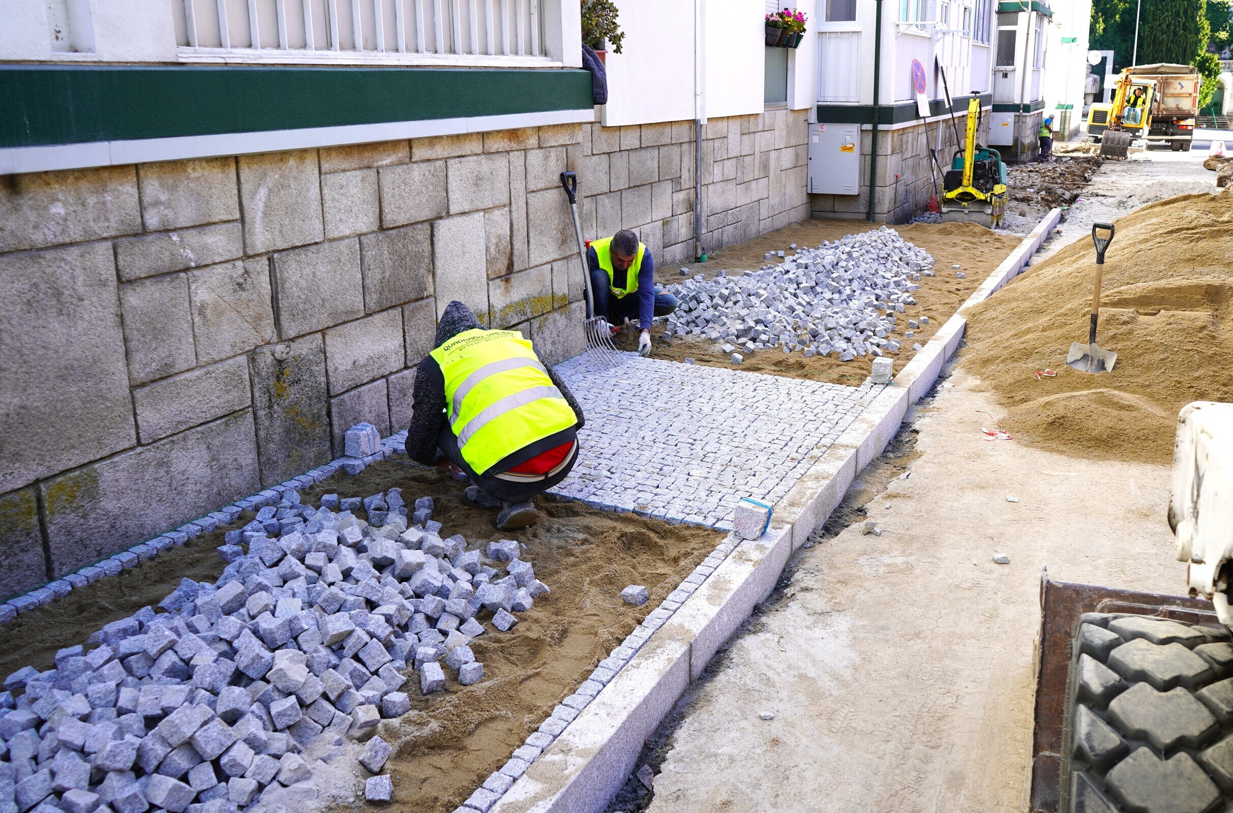 Os trabalhos em curso incluem a demolição dos pavimentos existentes e o fornecimento e a aplicação de lancis e calçadas em granito.